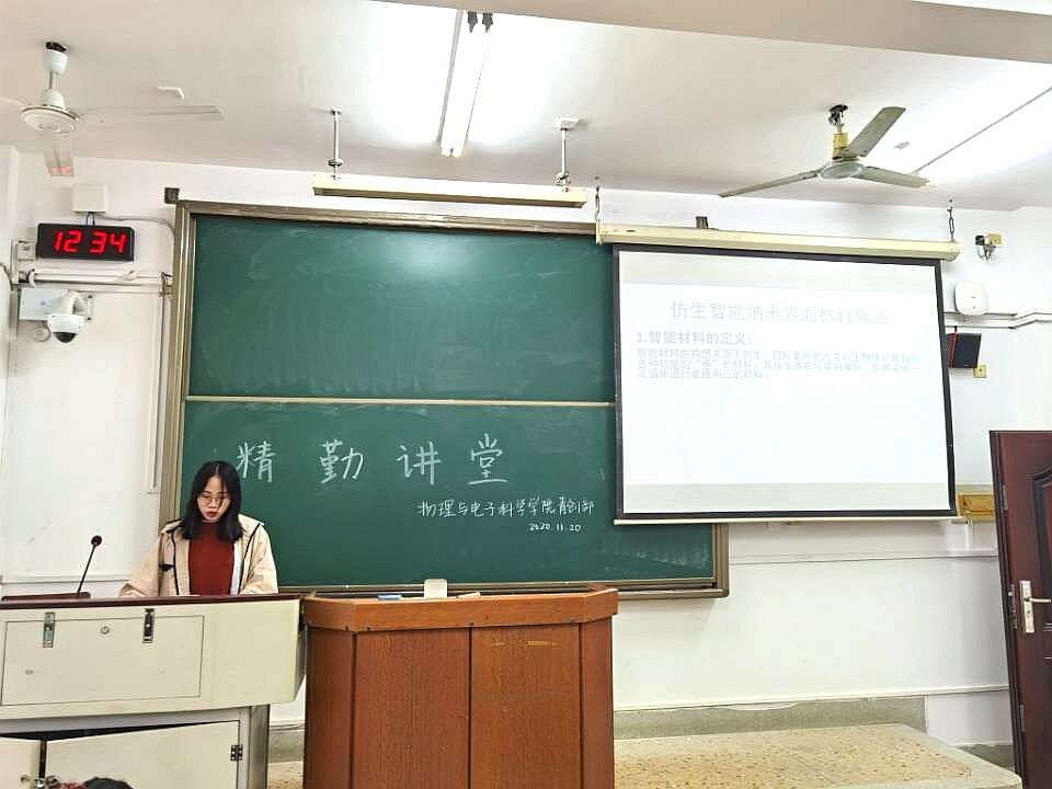艾岚向同学们介绍了智能材料的定义和仿生智能纳米材料的设计的五个层次。她从生命体与智能相关的问题中,引出对材料结构按尺度的划分、多尺度结构的特性和构筑的介绍,带领同学们了解生物体的特殊表面性能与植物表面的自清洁性,让同学们对仿生智能材料有了深入了解。她表示,研究仿生智能材料的重要科学意义在于,它将认识自然、模拟自然、超越自然有机结合,将结构与功能协同互补有机结合,为科学技术的创新提供了新思路、新理论和新方法,并希望同学们也将这种创新思维融入学习与生活中。