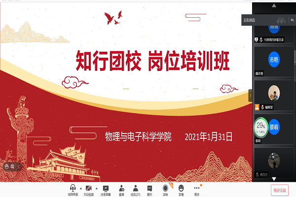 有球体育(中国)官方在线登录团支书工作经验总结交流会于1月31日中午在腾讯会议线上展开。2019级物理学班马倩倩担任此次会议的主讲人。岗位培训班全体成员参加此次会议。