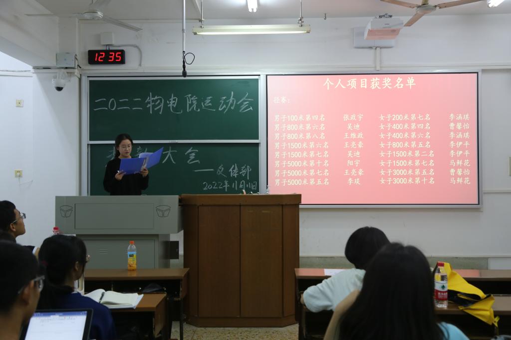 主持人以图片的形式回顾了物电院的运动员们在此次校运会上的精彩瞬间。这些精彩瞬间展现了运动员们坚持不懈、顽强拼搏的精神。最后,工作人员依次给获奖运动员颁发了个人项目奖、接力项目奖、优秀运动员奖、趣味项目奖等奖项。