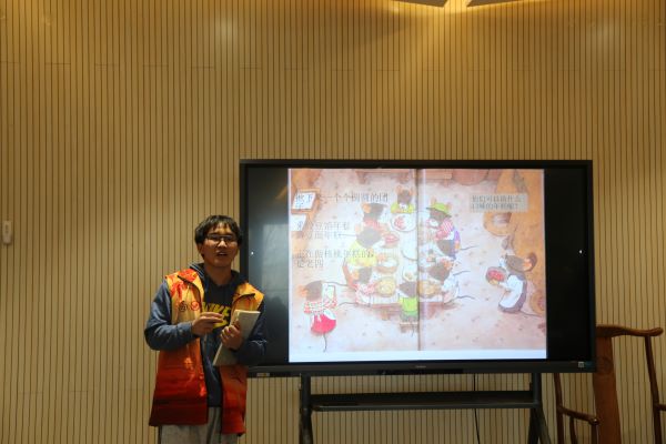 故事讲解前,主讲人唐亮与助教杨文博对小朋友们进行了自我介绍,在与小朋友们聊天的过程中活跃了在场气氛,为接下来的活动开展营造了良好的氛围。唐亮用生动的语言向小朋友们讲述了14只老鼠捣年糕的故事,讲故事期间设置了多个问题与小朋友们展开互动,小朋友们争相举手回答,回答问题的小朋友可获得糖果奖励,由此极大地调动了小朋友们的积极性。活动进行到绘画环节,唐亮逐步讲解了画小老鼠的步骤,小朋友们在志愿者的帮助下展开天马行空的想象,画出了自己心目中的老鼠家族。