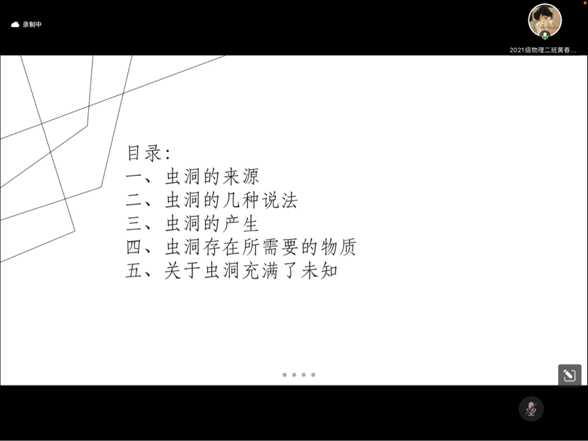 黄春伊从科幻电影中穿越时空的剧情引入主题。她从虫洞的来源、对虫洞的几种说法、虫洞存在的条件和人类目前对于虫洞的未知进行了讲述。她运用图片和比喻,帮助同学们更好地理解科学家对虫洞的几种说法。她通过提问引发大家对虫洞存在所需条件的思考,并以此为契机引出了人类目前对于虫洞的未知。她引用爱因斯坦的话“科学绝不是也永远不会是一本写完了的书。”作为结语,并鼓励同学们在仰望星空的同时脚踏实地,在物理的方向上不断前行。