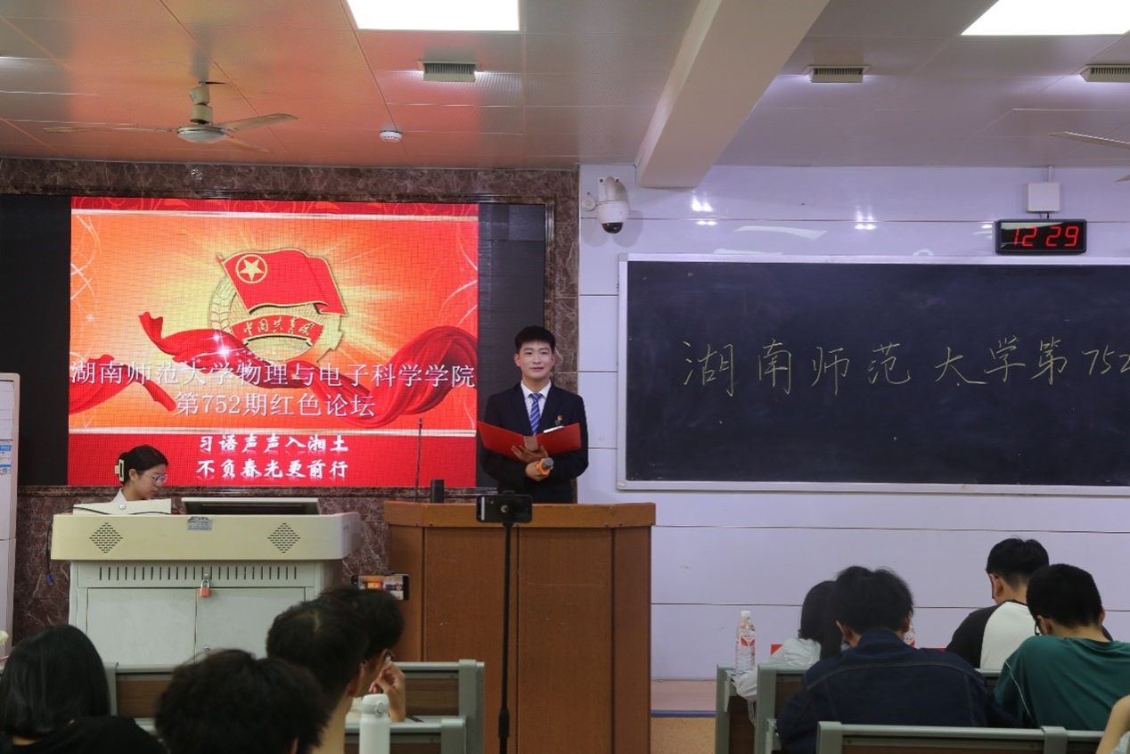 (通讯员 陈泽瑞 黄丹)5月10日中午,有球体育(中国)官方在线登录(以下简称物电院)团委宣传部于格物楼109教室举办以“习语声声入湘土,不负春光更前行”为主题的第752期红色论坛。2021级黄春伊,黄璟和,2022级马倩偆、姚俊柯担任主讲人,2023级张梁宇担任主持人,团委负责人蒋文卓出席此次活动。2022级、2023级部分学生参与。