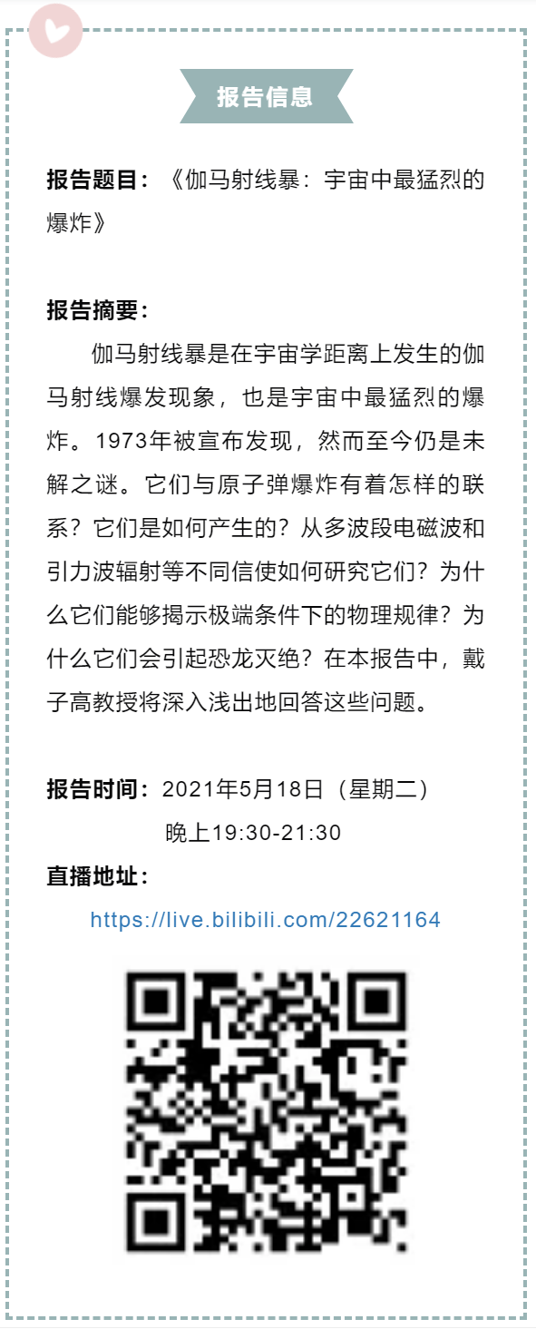 5月18日晚上19:30,戴子高教授将在有球体育(中国)官方在线登录(有球体育(中国)官方在线登录)格物楼509报告厅带来一堂讲座—《伽玛射线暴:宇宙中最猛烈的爆炸》。届时,师大天文馆将在B站进行同步直播。