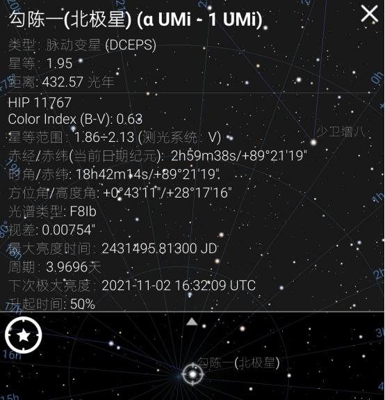 在找到了猎户座以后,在它的边上有许多动人的星辰,例如把视线再往极北望去,便能找到家喻户晓的勾陈一,也就是北极星,自古至今,位于极北的星辰发生过几次改变,在公元前3000年,北极星不是小熊座α,而是天龙座α,一颗3.7等的恒星,中国古代称它为右枢。到公元前1000年,小熊座β(中文名北极二)比较靠近北天极,既然全天星星围绕它转,古人便认为它是天上的天子,故又起名曰帝,又因为它在紫微垣的中心位置,又叫它紫微星。