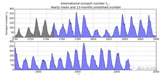 黑子的活动周期为11年,活跃时会对地球的磁场产生影响,当太阳上有大群黑子出现的时候,会出现磁暴现象使指南针乱抖动,不能正确地指示方向;无线电通讯也会受到严重阻碍,甚至会突然中断一段时间等等。太阳黑子活动的峰值与太阳活动的最大值重合,太阳活动的最小值出现黑子间断。太阳黑子的位置在整个太阳活动周期中也会发生变化。在太阳活动最大期,许多太阳黑子出现在中纬度地区(大约北纬30度,南纬30度)。然后,太阳黑子逐渐向赤道移动,在太阳活动极小期几乎没有太阳黑子。甚至有时,在太阳活动极小期,看不到太阳黑子。太阳黑子数量变化以平均11年的周期而变化,如果不想错过这次观测太阳黑子的活动的话,就快来加入我们吧!