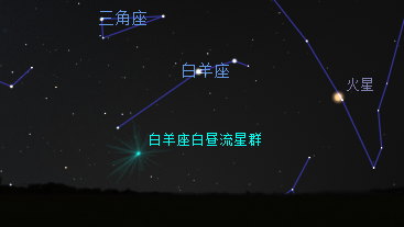 白昼白羊座流星雨(Daytime Arietids,00171 ARI)出现日期介在5月14日至6月24日之间,今年极大期落在6月7日,ZHR~30,2颗/时。由于辐射点在凌晨三点升起,距离日出仅两个小时,因而被称为白昼白羊座流星雨。它是一年之中最活跃的白昼流星雨,有许多记录和论文。这个流星雨是英国卓瑞尔河岸天文台在1947年夏天用无线电设备发现的。因辐射点位于太阳以西约30度(赤经α:44°,赤纬δ:+24°),所以肉眼很难看到。幸运的话,有些流星在清晨时分也可以看到,通常在黎明前一小时。