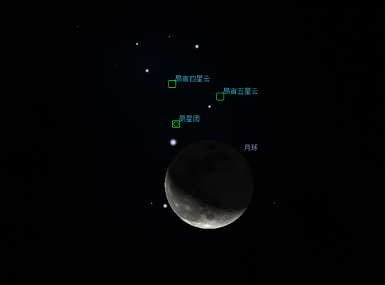 这一天月球会接近金牛座的昴星团2度左右。月龄为23.7,5天后为新月。因为月亮比月牙胖一点,所以月光很耀眼,昴星团很难看到吧。请使用小型天文望远镜进行观测。中国台湾南部及海南三沙市、马来西亚、新加坡、印度尼西亚可见月掩昴星团。