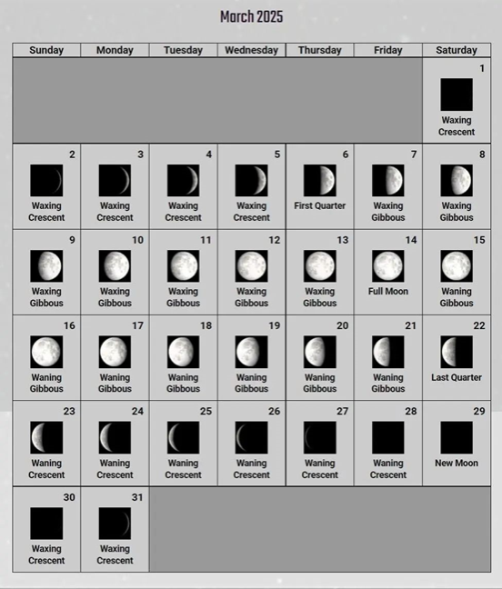 2025年3月9日08:27火星合月(视赤经7h19m56s),地心所见火星在月球以南1.67度的地方。19:45北河三合月(视赤经7h46m53s),地心所见北河三在月球以北1.99度的地方。