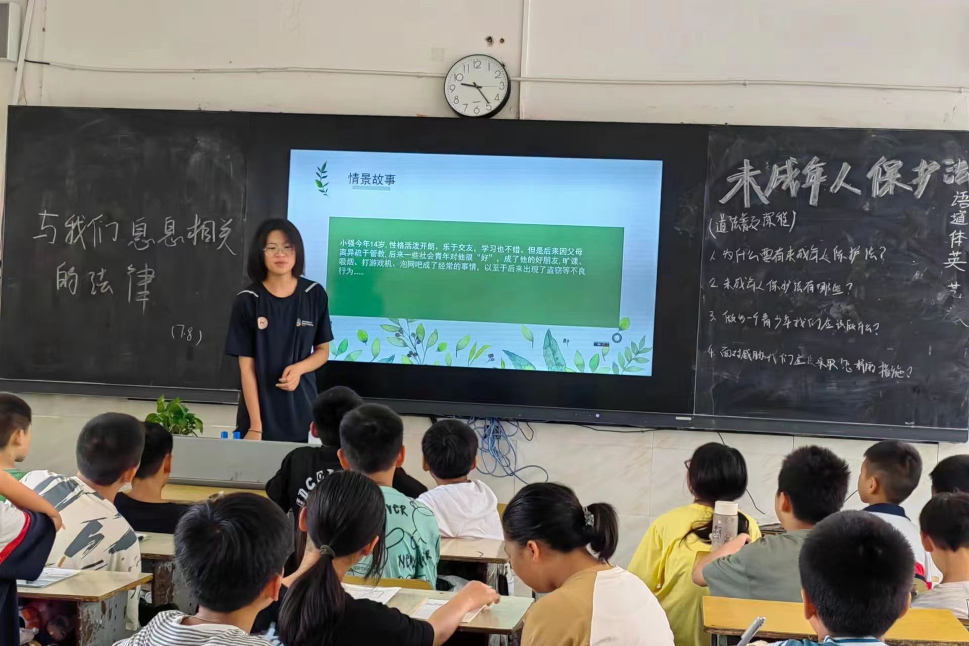 此次普法课堂围绕未成年人保护法进行学习,黄雨欣通过举例分析真实发生的案例事件,结合未成年人的性格特点,提出“为什么要加强未成年人保护”和“未成年人保护法的重要性”两个课堂重点。课堂上,同学们积极答题并列举出根据网络信息所了解到的未成年人违法相关事例。针对同学们的发言,黄雨欣耐心补充了同学们对于法律知识学习的欠缺之处,并解答了个别法律案例中同学们存在的疑惑。