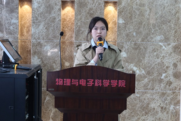 活动伊始,在主持人的带领下,全体起立奏唱团歌。然后物电院团委书记许佳琪上台致辞。她首先介绍三下乡活动的起源,然后提出三下乡活动的三点意义:第一,延续物电院的活力,传承物电院良好的传统;第二,重新审视自己,面对未来,提高站位,增强社会责任感,培养家国情怀;第三,锤炼自身本领,将理论与实践相结合。